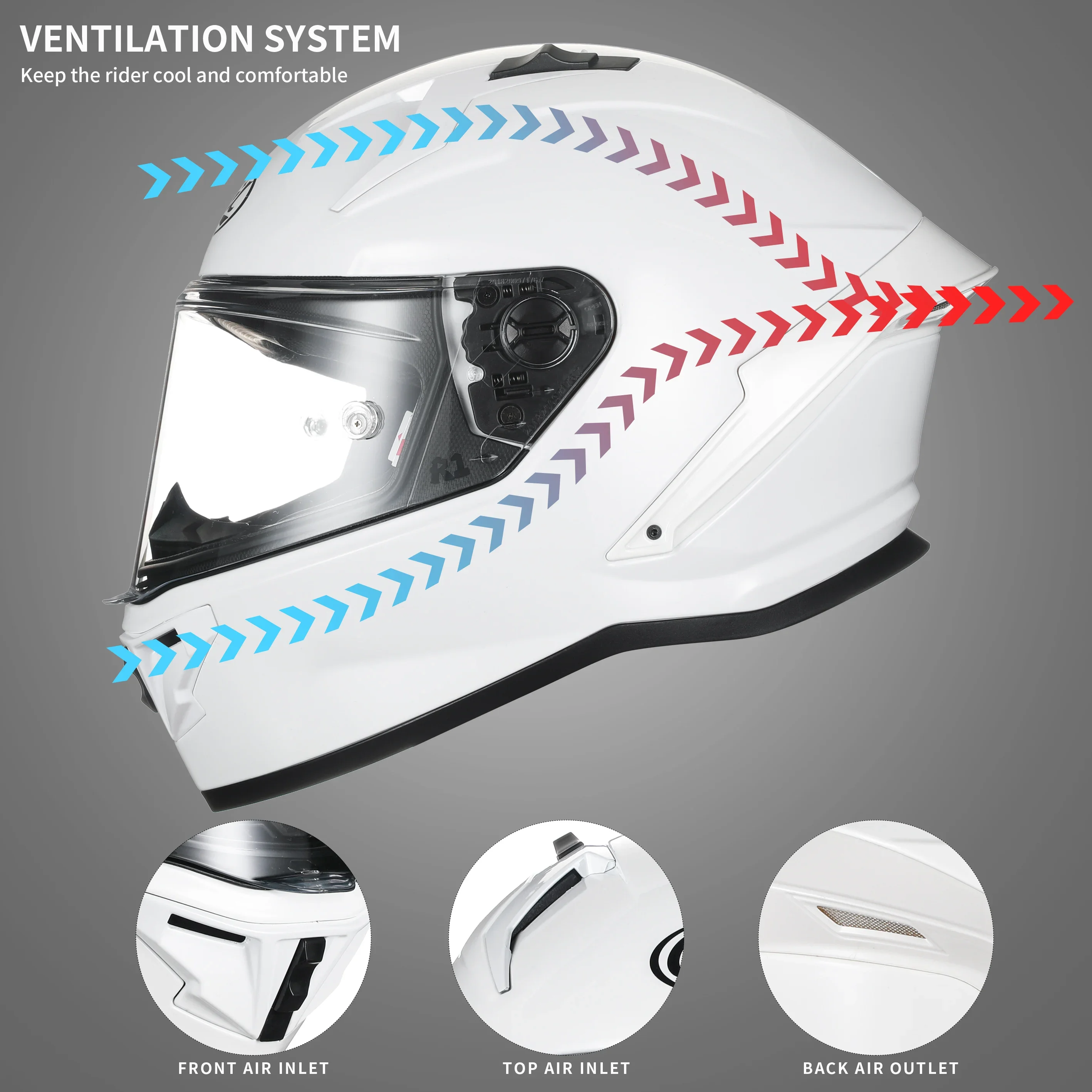 Ventilation design on the top of the head and mouth and back air outlet to keep the head cool and improve rider comfort and , while also suitable for all seasons.