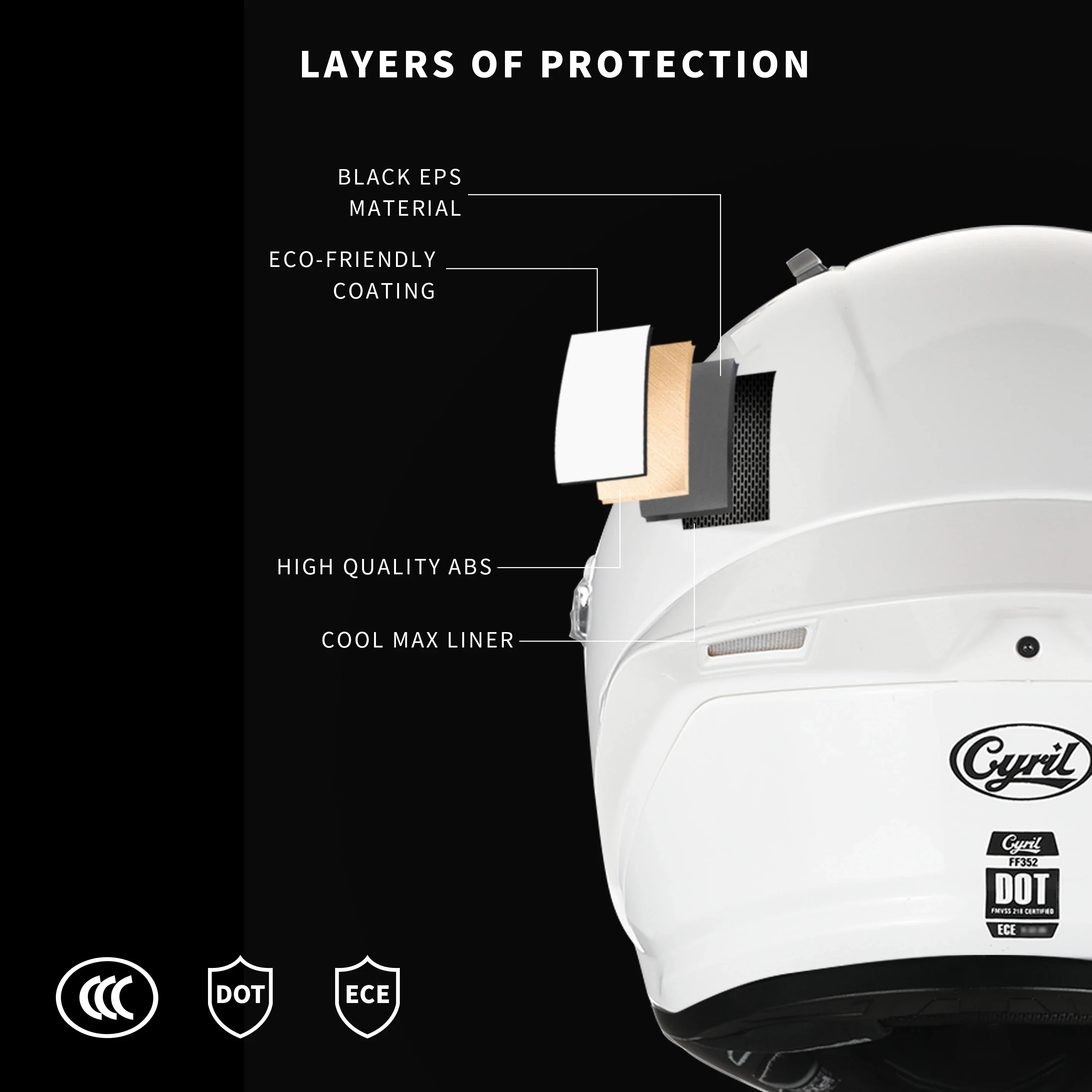 Meets or Exceeds FMVSS-218 and DOT ECE 22-R22/05 Safety Standards.