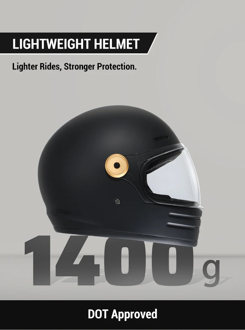 Experience the perfect combination of light protection and excellent aerodynamics with our fiberglass helmet. Weighing just 1,400 g, it offers easy wear without compromising safety, supported by DOT certification for reliable impact.